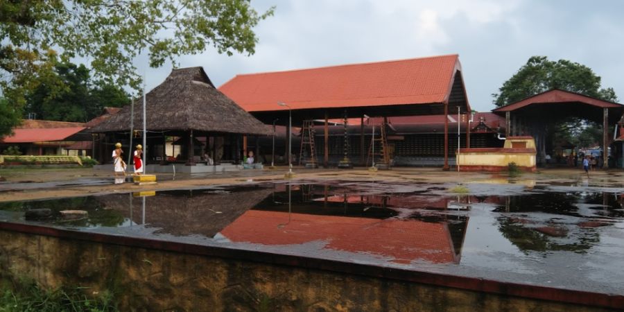 The temple complex consists of a Sreekovil (sanctum sanctorum), Nalambalam (inner courtyard), and Koothambalam (temple theatre). The roof has sloping wooden tiles that help with Kerala’s heavy monsoons.
