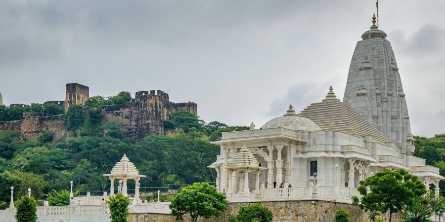 Highways link Jaipur to all major cities in Rajasthan and beyond. You can travel by bus, private cab, or your own car. The temple is right in the city, below Moti Dungri Fort, and is easy to spot thanks to its white domes rising above the trees.