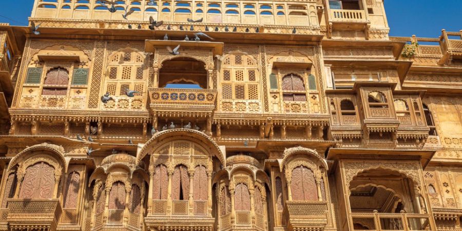 Reflecting the artistic inspirations of the time, Patwon Ki Haveli is a masterwork of Rajput, Mughal, and Victorian architectural traditions. Typical of Jaisalmer's architecture, yellow sandstone lends the haveli its distinctive golden hue.